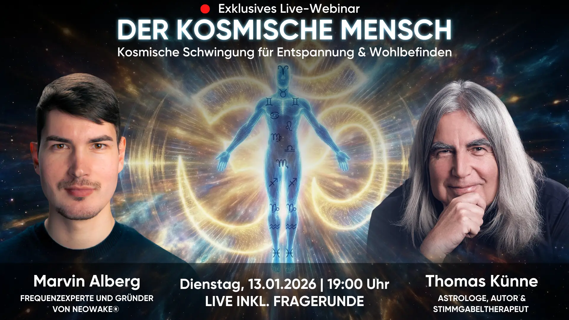 Tauche am 13.01.2026 um 19 Uhr im exklusiven LIVE Webinar mit Marvin Alberg und Gast-Experte Thomas Künne in die faszinierende Welt der kosmischen Schwingung ein.