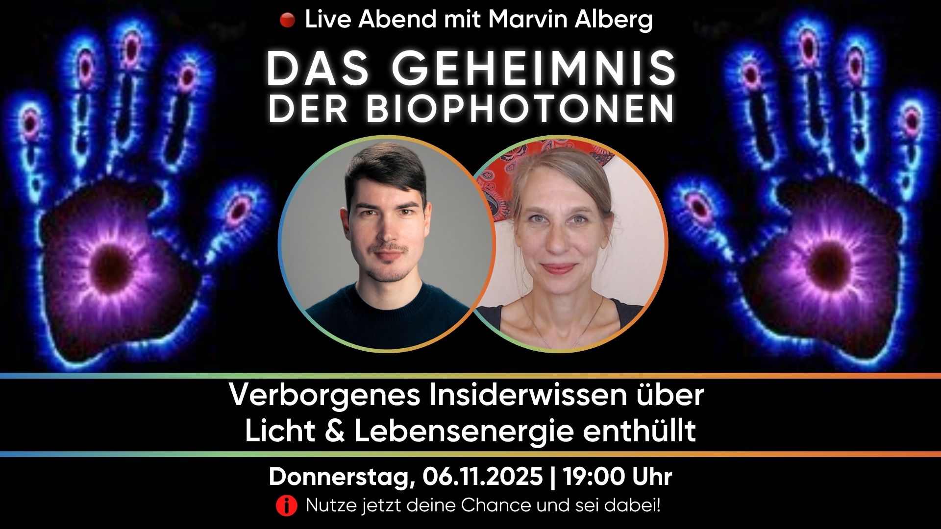 In diesem LIVE Webinar am 23.07.2025 um 19:30 Uhr lüften wir den Schleier der geheimnisvollen Wirkung der Biophotonen und zeigen dir, warum sie der verborgene Schlüssel zu mehr Lebensenergie und Regeneration sein könnten.