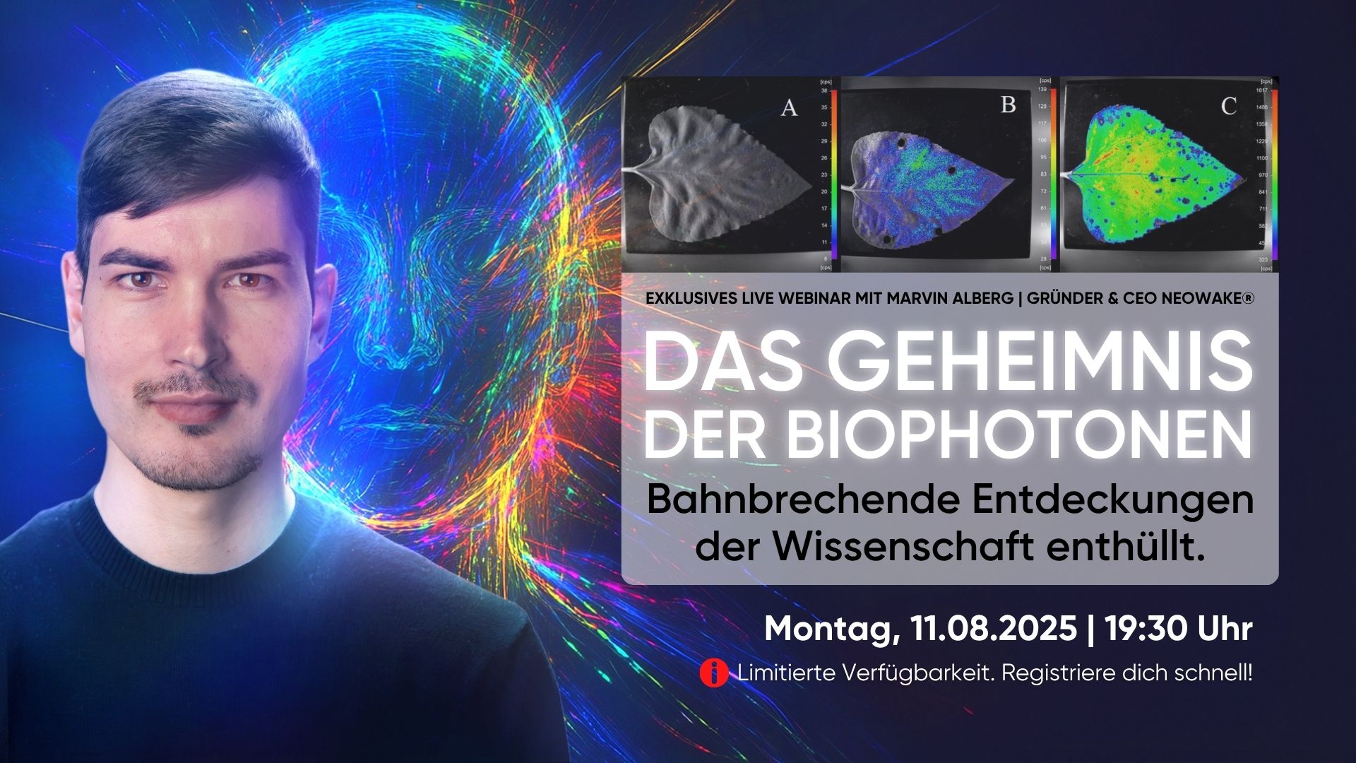 In diesem LIVE Webinar am 11.08.2025 um 19:30 Uhr lüftet Marvin Alberg, Gründer & CEO von neowake®, den Schleier der geheimnisvollen Wirkung der Biophotonen und zeigt dir, warum sie der verborgene Schlüssel zu mehr Lebensenergie und Regeneration sein könnten.