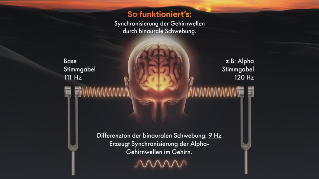 Die BASE-Stimmgabel mit 111 Hz dient als konstante Referenz. Wird sie gemeinsam mit einer anderen Gabel angeschlagen, entsteht dadurch eine sogenannte binaurale Differenzfrequenz, also die Differenz zwischen den beiden Tönen. Diese Schwebung liegt exakt in jenem Bereich, in dem unsere Gehirnwellen typischerweise schwingen.